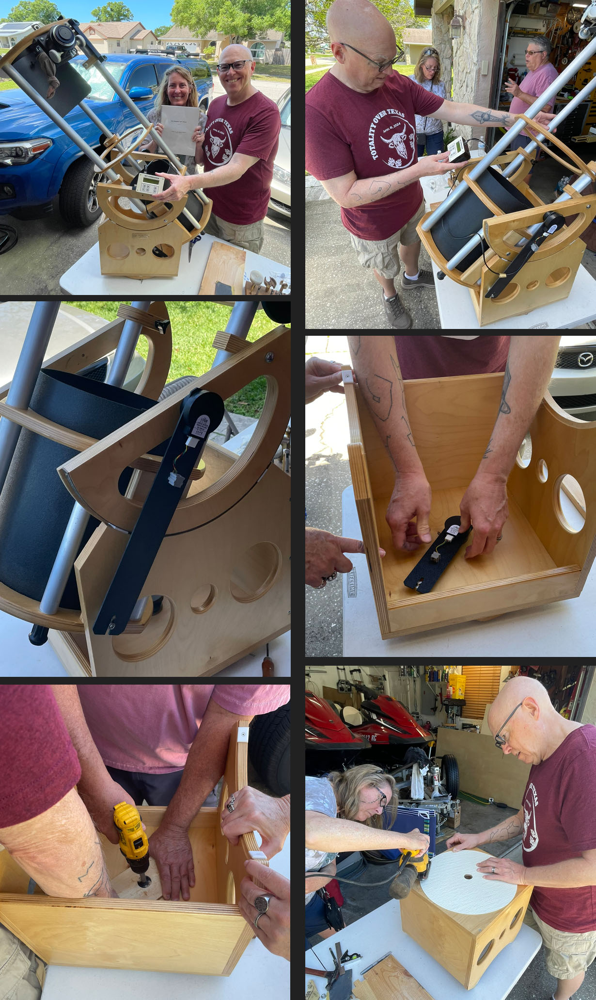 Liz and Greg ground their mirror at the lab about 20 years ago. Recently they decided to add a Sky Commander Digital Setting Circles (DSC) with its encoders to their scope. With a little help from a Lab instructors Ralph and Allen the Sky Commander was installed. Along the way we found a bump in the faux Formica that they smoothed out. The DSC works and the scope has smooth motion. |